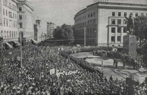 Autors nezināms. (1950) Ļeņina pieminekļa atklāšana Rīgā 1950. gada 20. jūlijā Ļeņina (Brīvības) un Kirova (Elizabetes) ielu krustojumā. [Fotogrāfija] Zvaigzne, Nr. 2, 7. lpp.