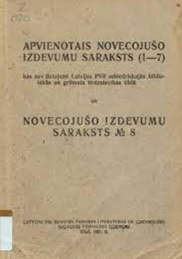 Apvienotais novecojušo izdevumu saraksts (1–7), kas nav lietojami Latvijas PSR sabiedriskajās bibliotekās un grāmatu tirdzniecības tīklā un Novecojušo izdevumu saraksts № 8. (1951) Rīga: Latvijas PSR Ministru Padomes Literaturas un izdevniecību galvenā pārvalde.