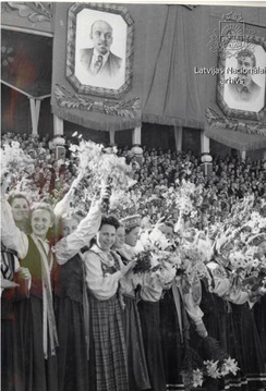 Seno Dziesmu svētku tradicijas atjaunotas pēc padomju varas uzvaras Latvijā. Bet šo svētku saturs tagad ir citāds. Agrāk tautas melodijās skanēja skumjas un ilgas pēc tā, kas šķita gandrīz nepiepildāms, – pēc brīvības un laimes. Šodien tauta dzied citādas dziesmas – par šo ilgu piepildīšanos. Mūsu Dziesmu svētki ir latviešu tautas kulturas – nacionalas pēc formas un socialistiskas pēc satura – uzplaukuma spilgta demonstracija. Šo uzplaukumu Latvija varēja sasniegt un sasniedza tikai padomju tautu brālīgajā saimē. [..]