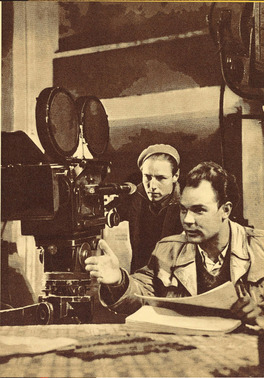 Legzdiņš, Ž. Kinorežisors Varis Krūmiņš un kinooperators Māris Rudzītis filmas „Zvejnieka dēls” kadru uzņemšanā. [Fotogrāfija] Zvaigzne, Nr. 23 (01.12.1956.), 33. lpp.