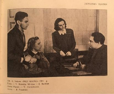 Autors nezināms. (1951) A. Sakses lugas „Pret kalnu” iestudējums Jaunatnes teātrī ar režisoru Borisu Praudiņu. [Fotogrāfija] Jaunatnes teātra krājums.