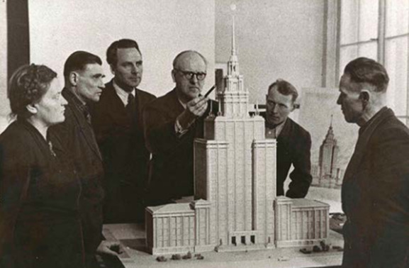 Autors nezināms. (1951). Arhitekts Osvalds Tīlmanis ar darba grupu pie ēkas maketa. [Fotogrāfija] Latvijas Arhitektūras muzeja krājums.
