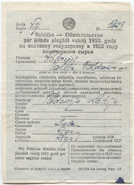 Salas ciema padome. (1952) Par kolhoznieku saistību izpildi kolhozam. Saistība par jēlādu piegādi valstij 1952. gadā. [Dokuments] Jūrmalas muzeja krājums.